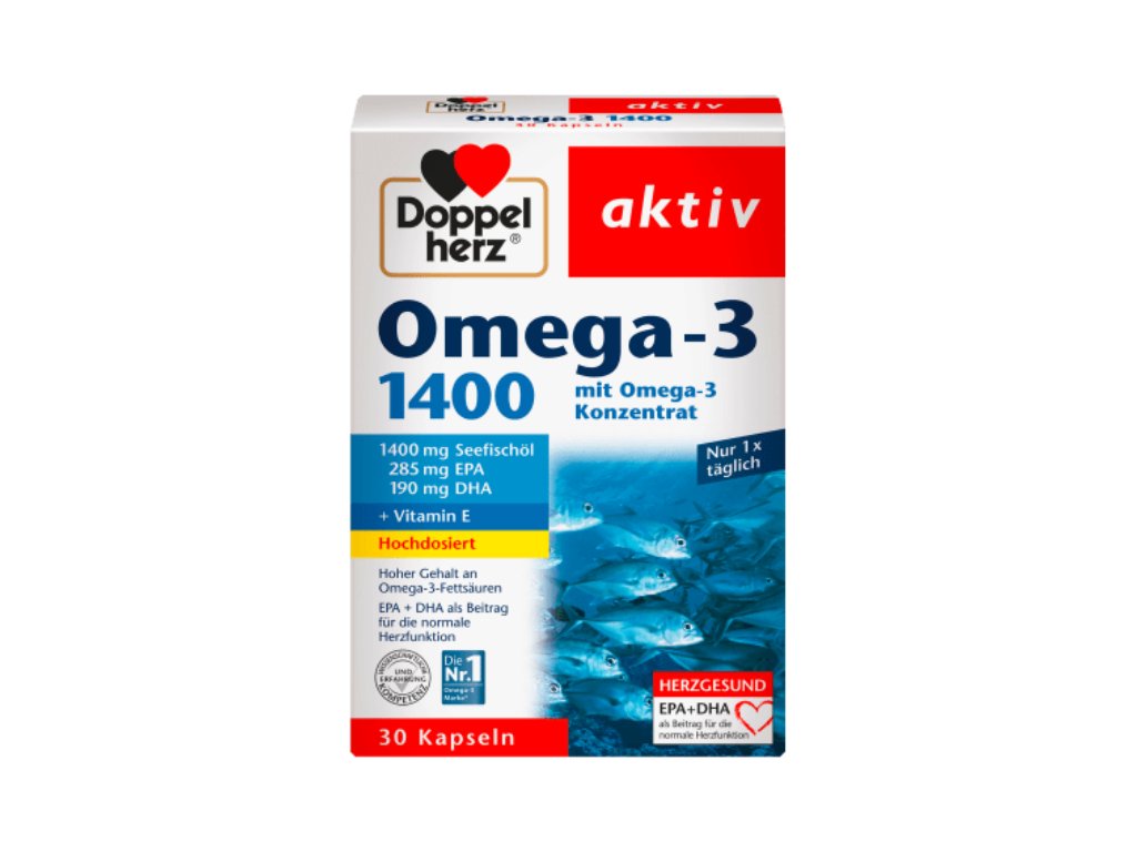 Popis: Doppel herz aktív Omega-3 1400 30 kapsúl Doppel herz aktív Omega-3 1400 obsahuje vysoké množstvo cenných omega-3 mastných kyselín z olejov morských rýb v koncentrovanej forme. EPA a DHA prispievajú k normálnej činnosti srdca. Tento pozitívny účinok nastáva pri dennom príjme 250 mg EPA a DHA. Vitamín E prispieva k ochrane buniek pred oxidatívnym stresom.