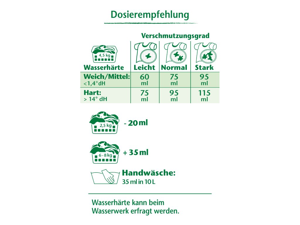 Dávkovanie: Použite zodpovedajúce množstvo pracieho prostriedku podľa tvrdosti vody a stupňa znečistenia a vždy perte s plne naplneným bubnom. Tvrdosť vody si môžete overiť u svojho dodávateľa vody.